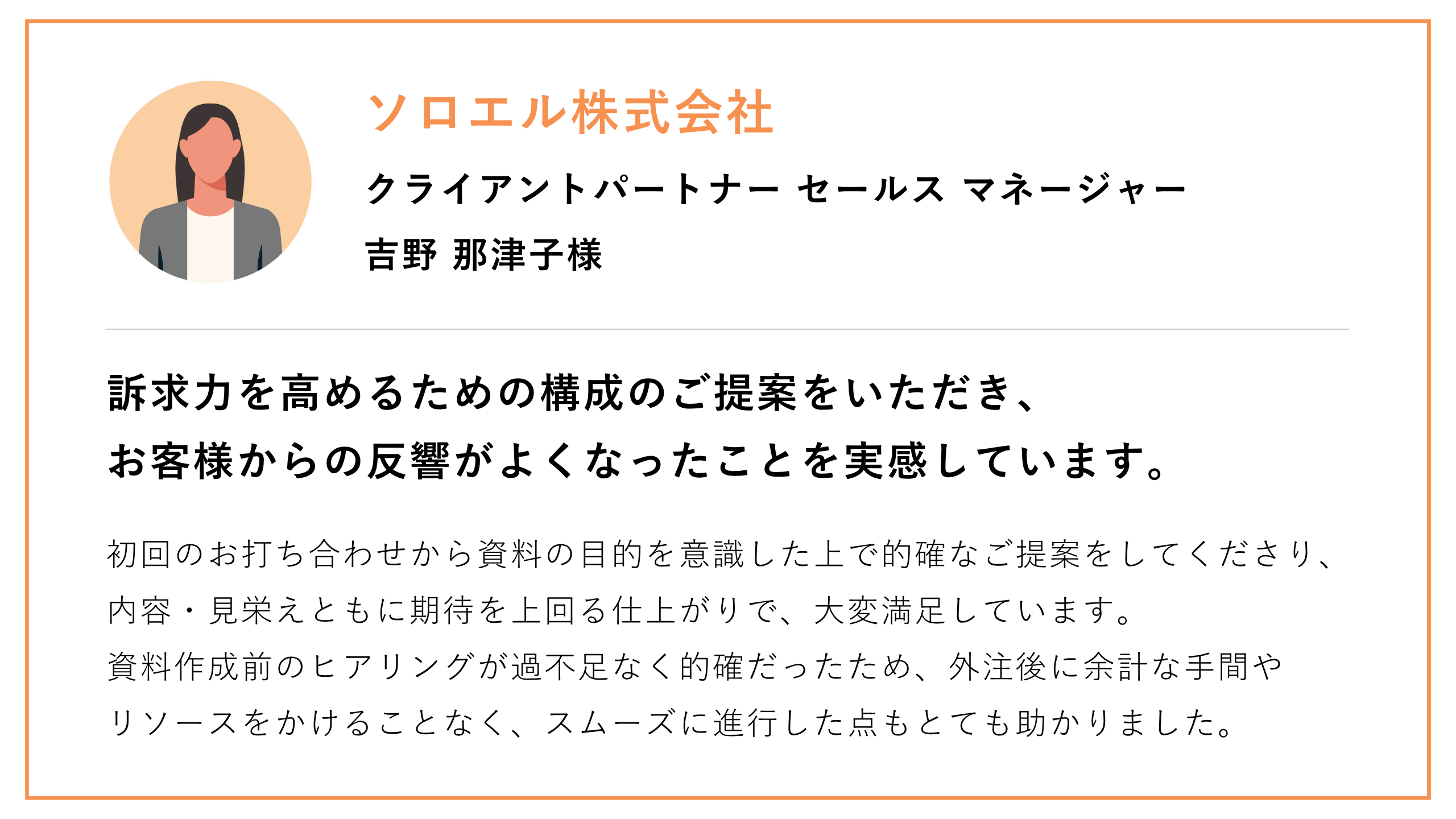 【ソロエル株式会社】資料の目的を踏まえた構成提案で訴求力の高い資料となりました