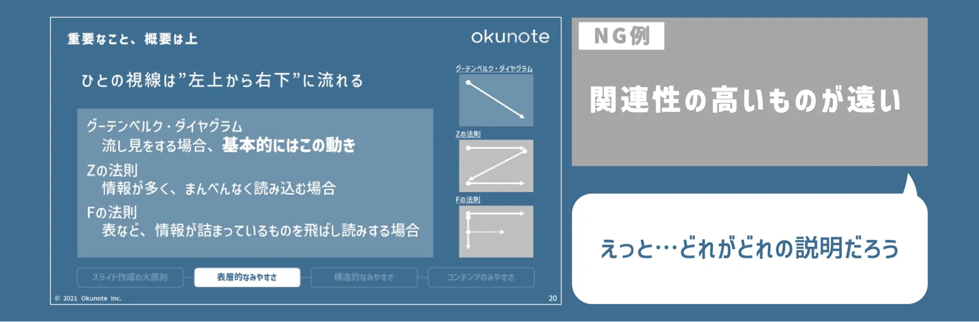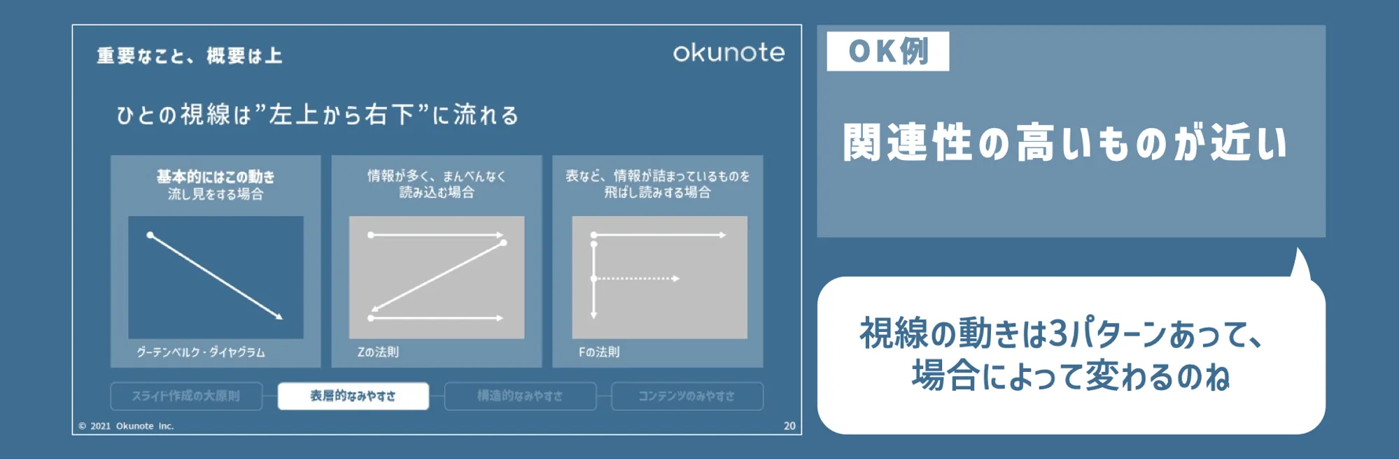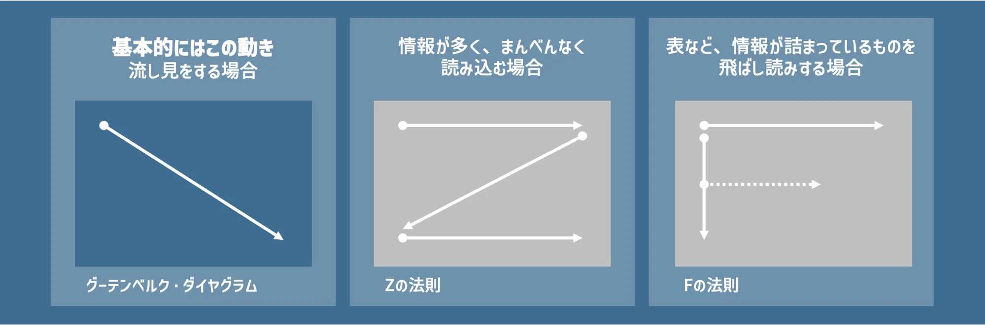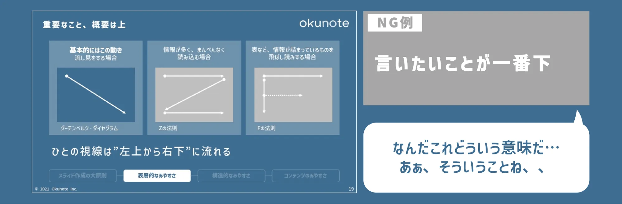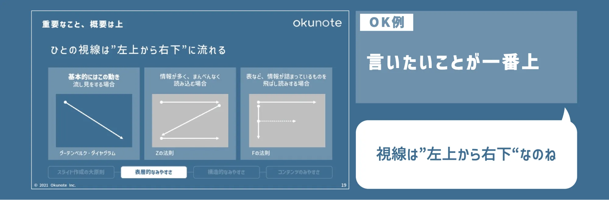 主な動きは3パターンとなっており、この流れを意識した配置を行うことで、誰が見ても分かりやすいと感じるスライドになります。