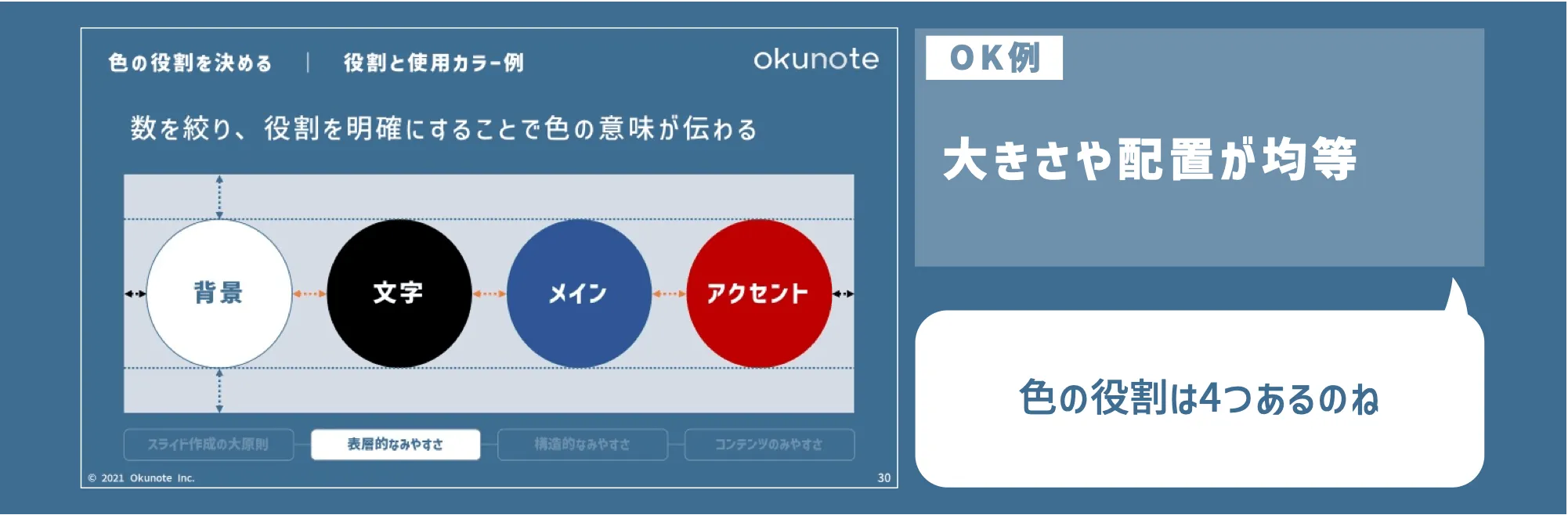 使用する色は数を絞り、それぞれの役割を明確にすることで色に意味を持たせることができます。