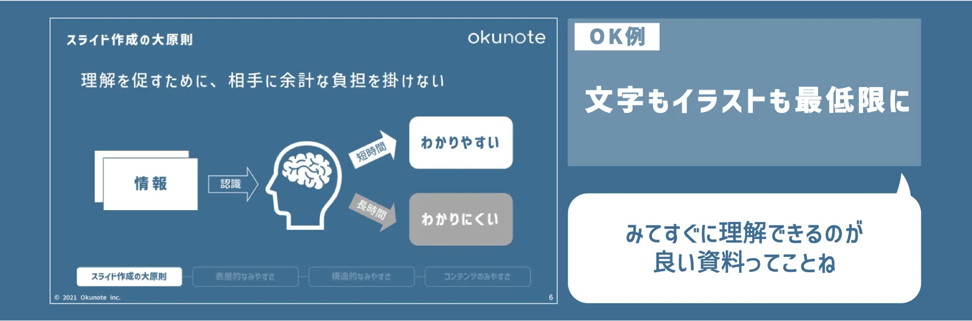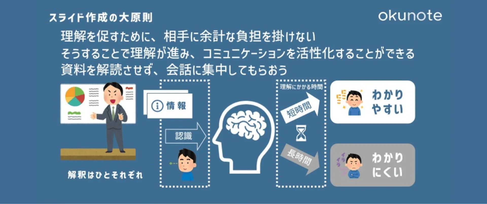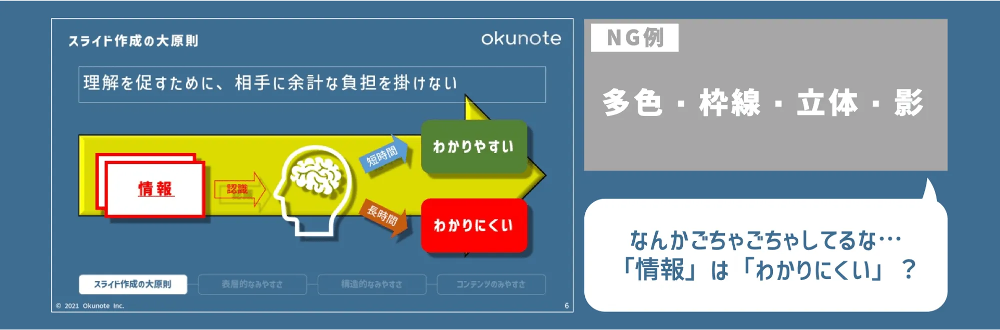 前述したように、情報量の多いスライドは、理解するまでに時間を要します。