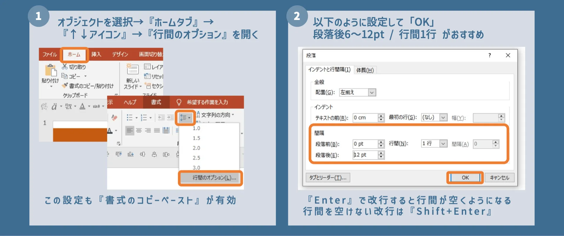 ただし、1行空けで改行してしまうと行間が空きすぎて不格好に見えるため、「行間のオプション」から設定します。