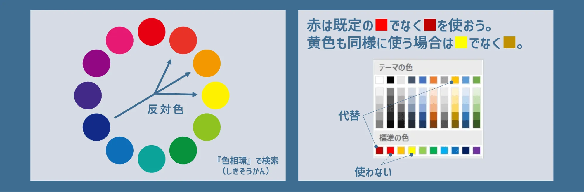「任意のカラー2色+無彩色」でスライドのデザインを作成するようにしましょう。