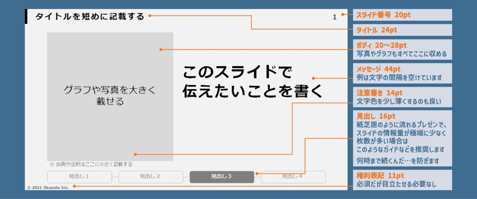 その場にいる相手に対する視認性やインパクトが重要となる登壇・ウェビナー資料では、企画書・報告書・提案書よりも文字は少なめかつ大きめに記載します。また、いまどのトピックスについて話しているのか、全体の何%位話したのか分かりやすくするため、「見出し」を設けるなど聞き手への配慮も大切となります。