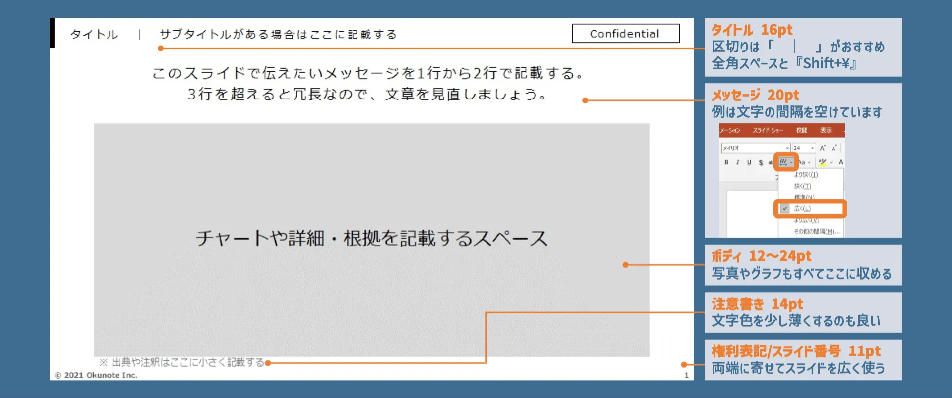 その場にいない相手にも展開される可能性が高い企画書・報告書・提案書では、誰が見ても誤解がないようにすることが重要です。そのため、各スライドにはからなず「メッセージ」を入れて、何が言いたいのかを明記することが大切になります。印刷で配布する可能性も高いので、擦れが目立たないよう背景色は白にするのがおすすめです。
