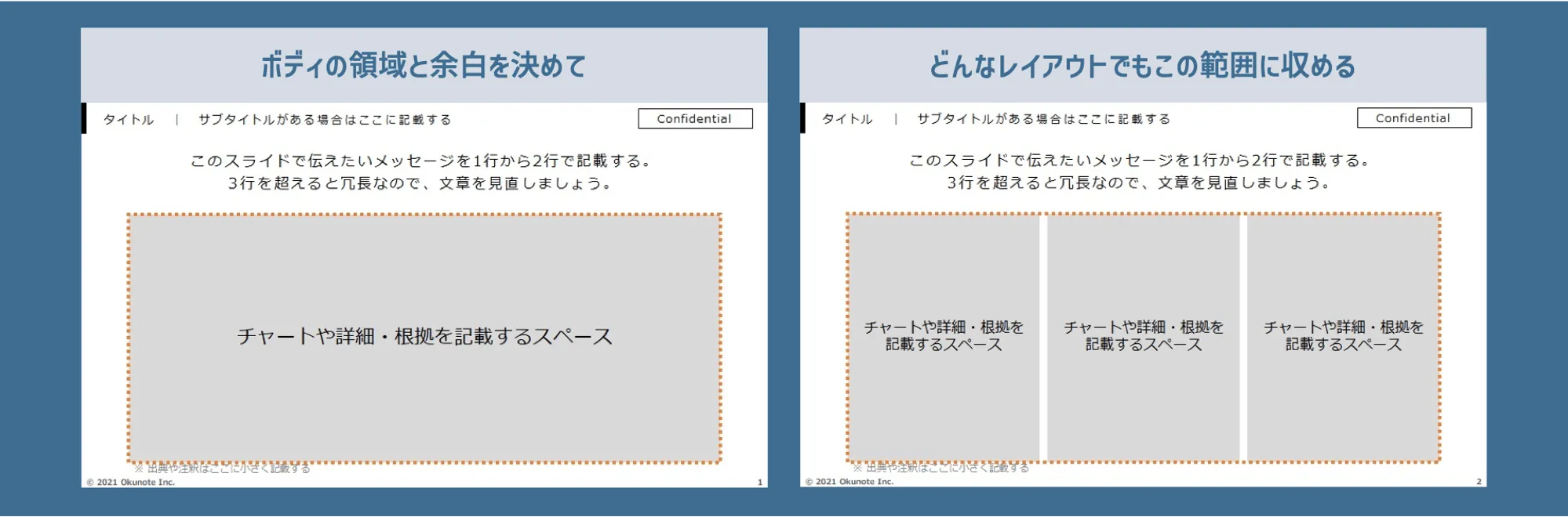 誰が見ても誤解が生じないようにする必要がある企画書や提案書と、印象付けが重要になるウェビナー資料とではレイアウトを使い分けるのがベターです。