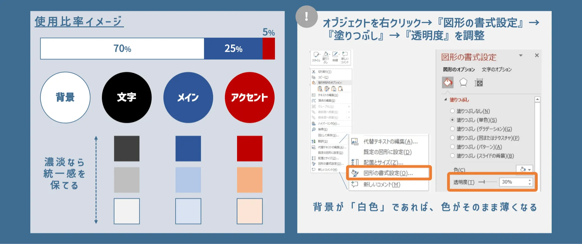 ここでのポイントは、図形の書式設定にある「透明度」で濃淡を調整し、『バリエーションを増やしても色を足さない』です。