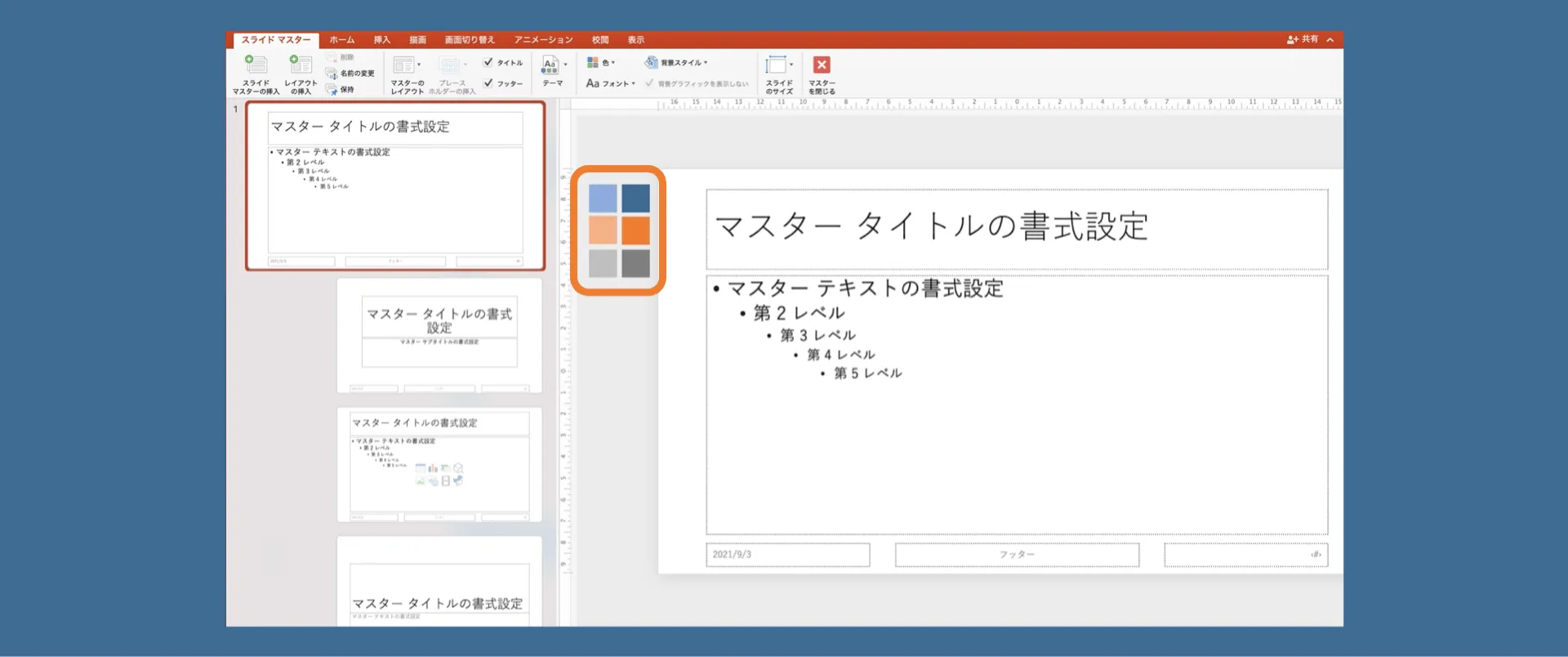 スライドマスターの欄外に、自分専用の「カラーパレット」を作っておくと、色の統一が容易になります。