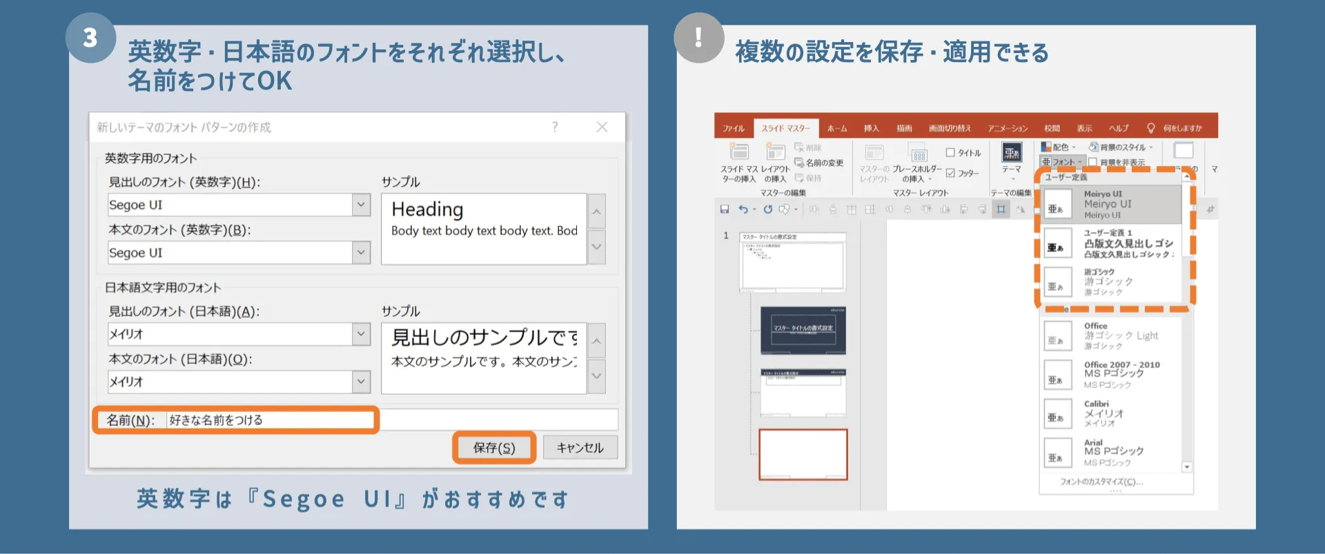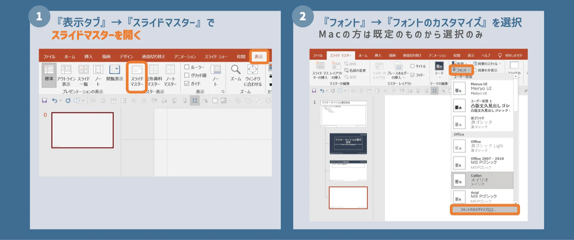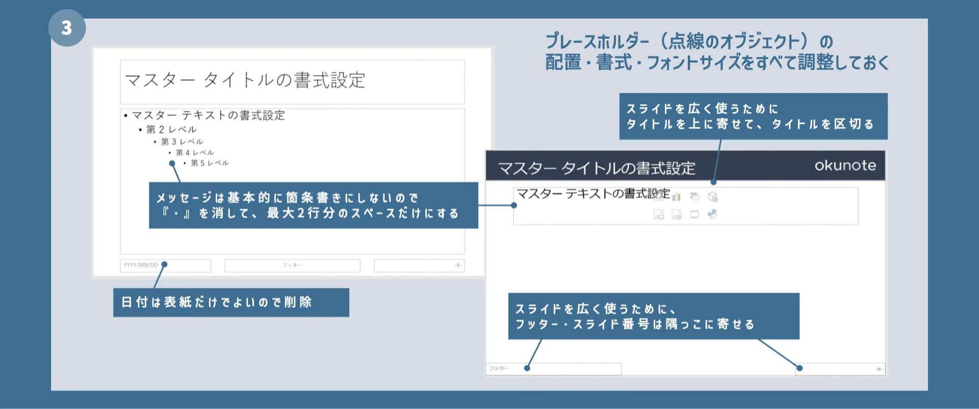 スライドマスターで一括で設定することで大幅な時間短縮につながります。