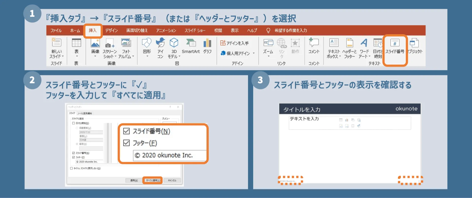 スライドマスターで「フッター」「ページ番号」の位置やサイズを変更し、挿入タブから表示設定を行います。