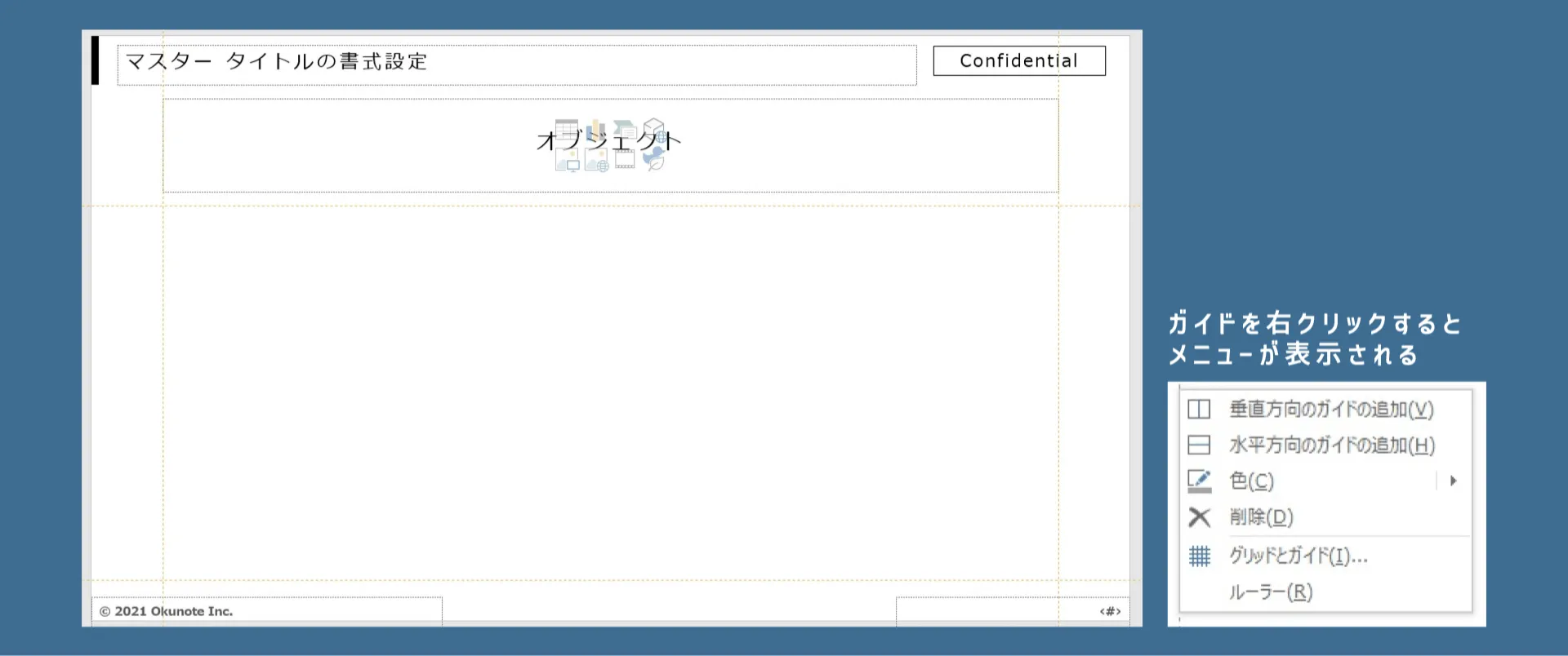 「表示タブ」→「ガイド」にチェックをいれる→スライドマスターを開く→ガイド線を右クリックでメニューが表示されます。