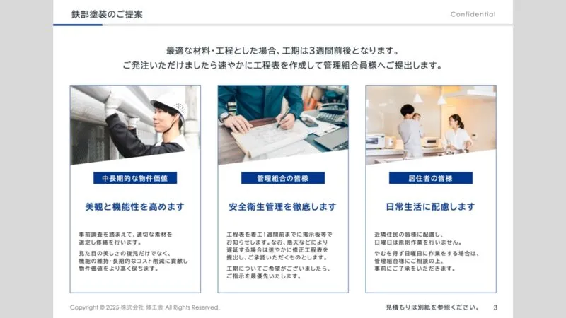 私たちは工事の管理・施工請け負っている会社なのですが、大規模修繕だけでなく、予算規模の大きくない案件を提案する機会も多く、その度に個別の提案書を作成することに時間と労力がかかっていることを課題に感じていました。